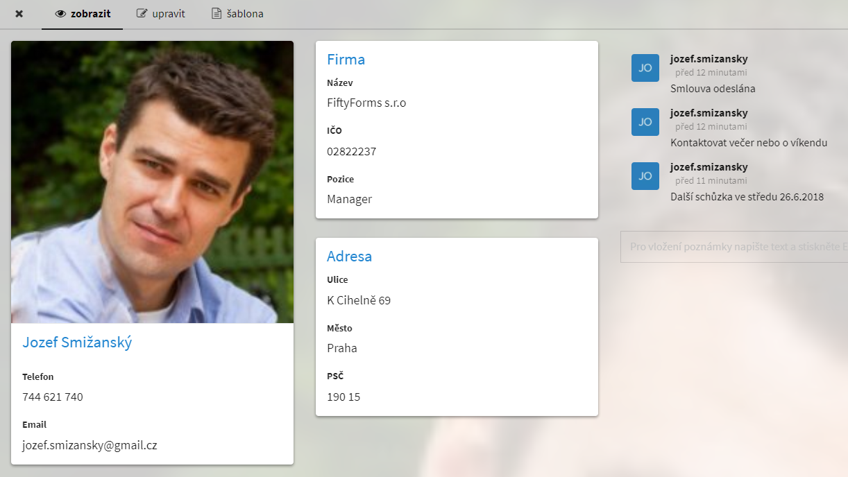 Všechny informace o vašich kontaktech přehledně na jednom místě. Sami určete, jaké položky chcete na kartě evidovat.