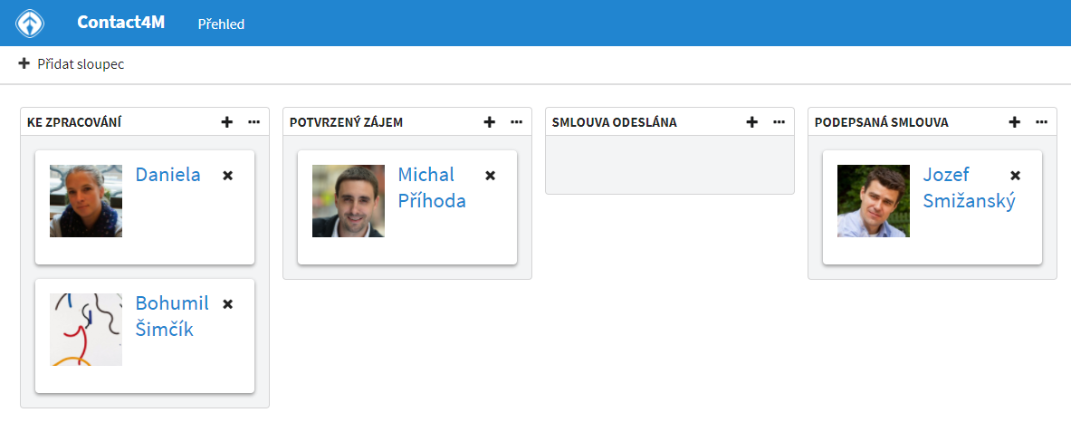 Přetahujte karty kontaktů mezi stavy podle aktuální situace.